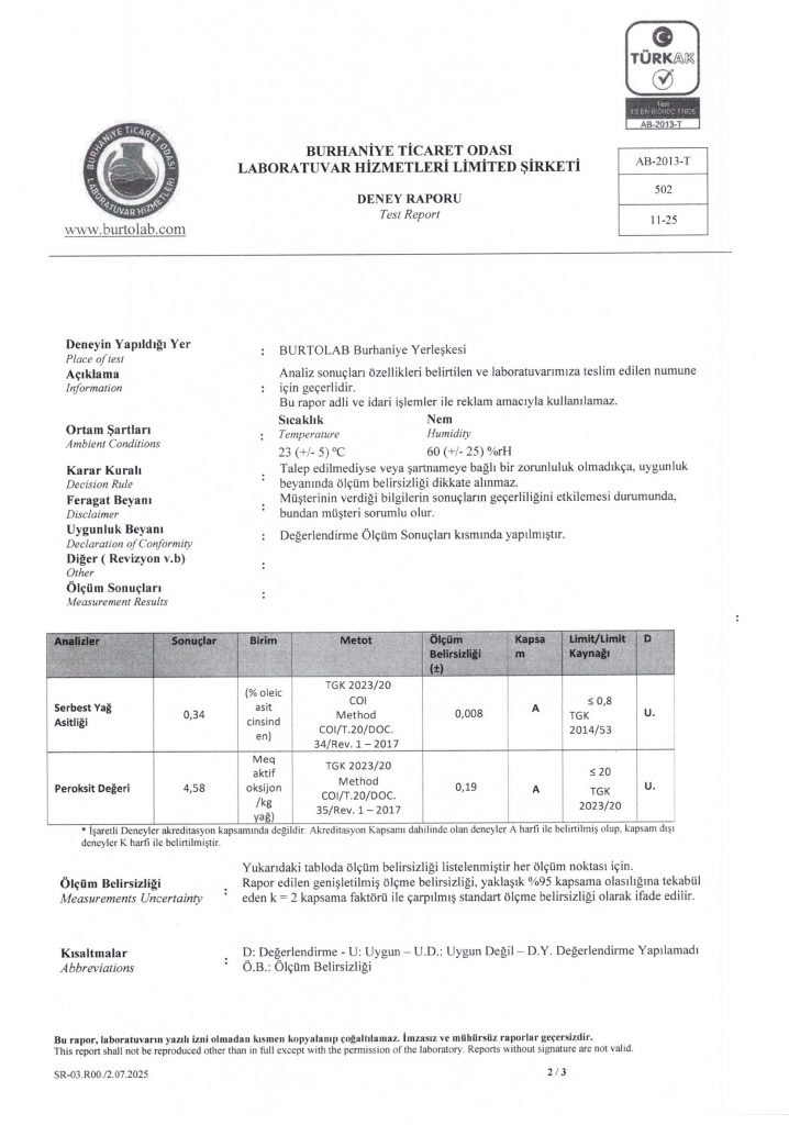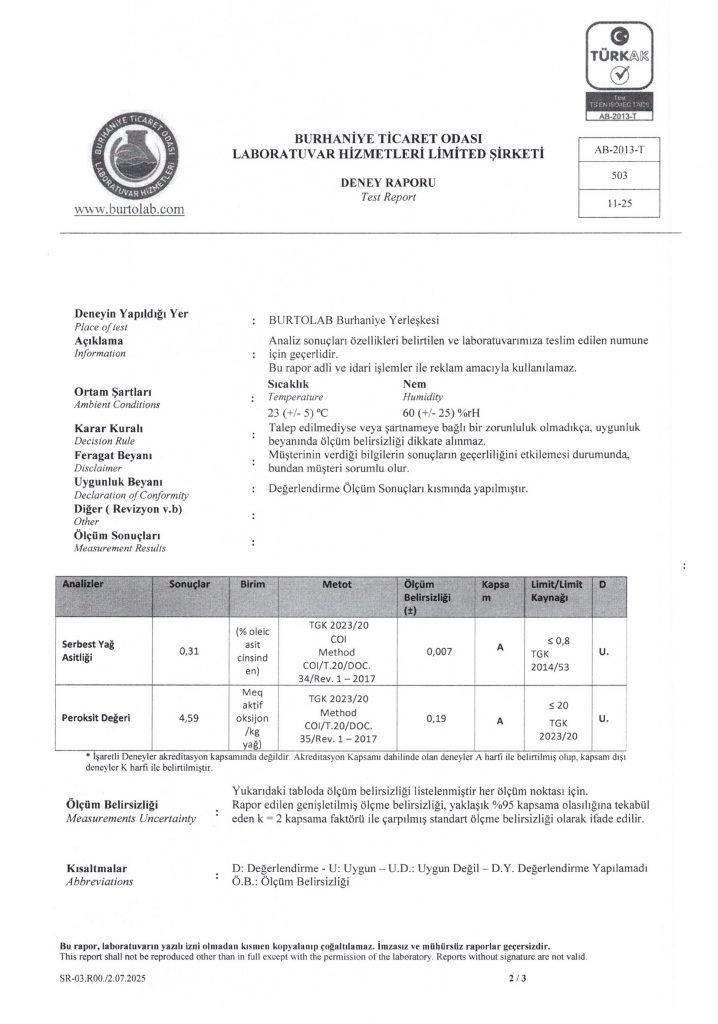Yeni sezon zeytinyağlarımızın asidite, peroksit ve polifenol sonuçları için görselleri inceleyebilirsiniz.